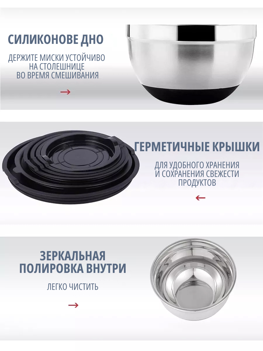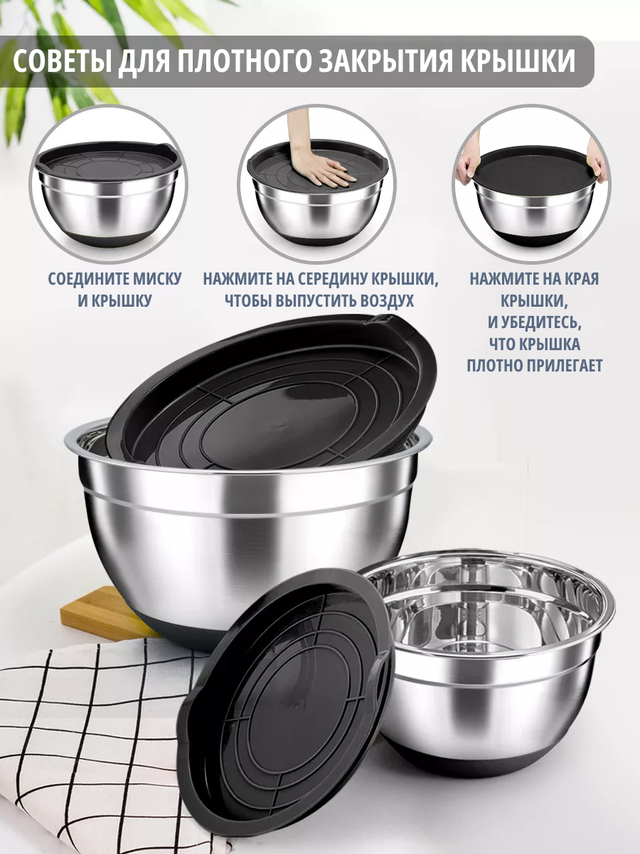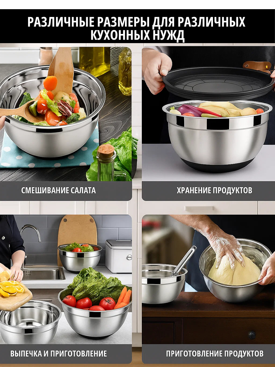 Металлический набор мисок с крышками и тёрками — это удобное решение для повседневной готовки и хранения продуктов.